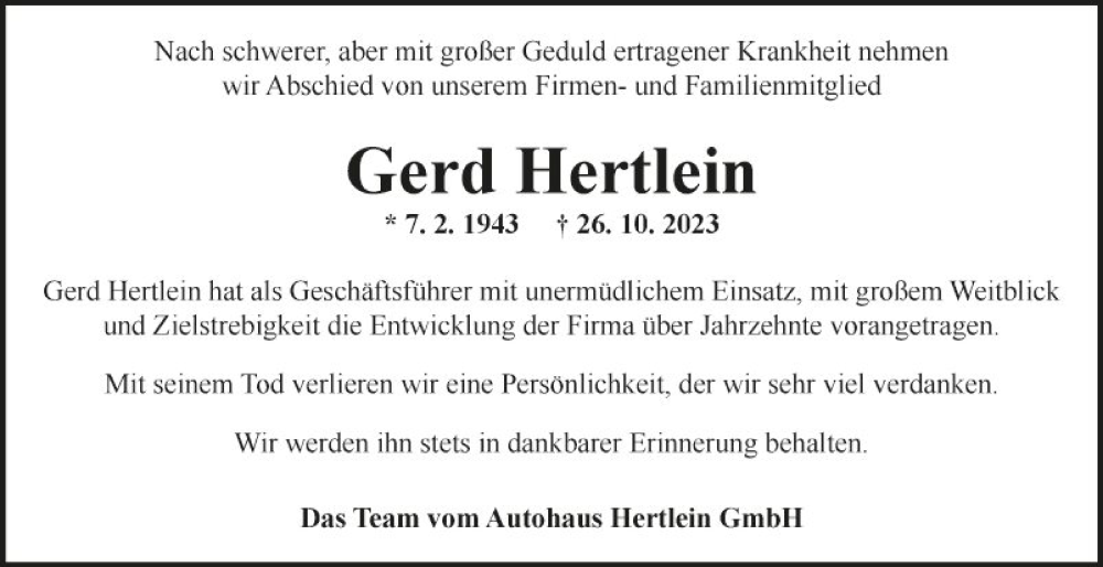 Hier finden Sie alle Traueranzeigen aus der Zeitung, die bisher für Gerd Hertlein erschienen sind. Weitere Traueranzeigen, die in der Zeitung erscheinen, werden hier ebenfalls aufgelistet