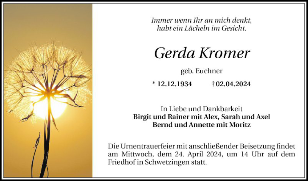 Hier finden Sie alle Traueranzeigen aus der Zeitung, die bisher für Gerda Kromer erschienen sind. Weitere Traueranzeigen, die in der Zeitung erscheinen, werden hier ebenfalls aufgelistet