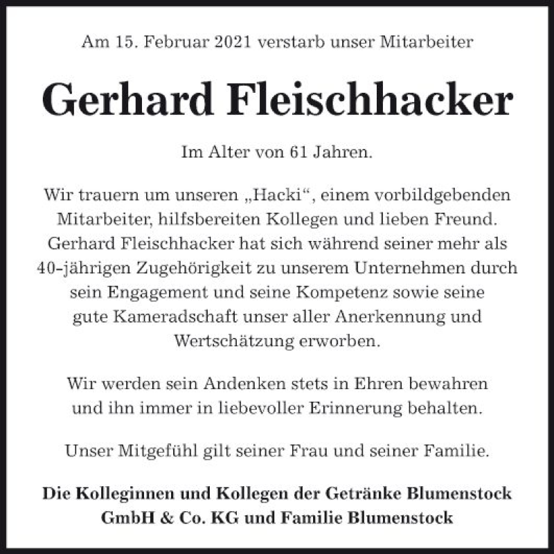 Hier finden Sie alle Traueranzeigen aus der Zeitung, die bisher für Gerhard Fleischhacker erschienen sind. Weitere Traueranzeigen, die in der Zeitung erscheinen, werden hier ebenfalls aufgelistet