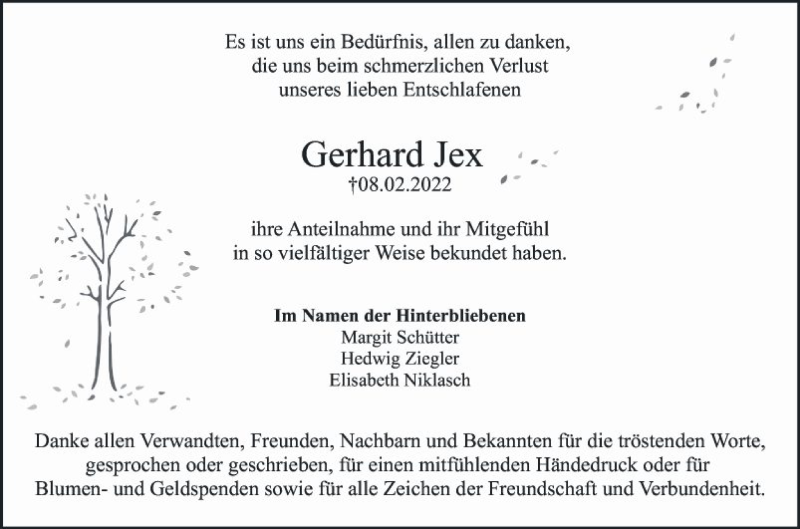 Hier finden Sie alle Traueranzeigen aus der Zeitung, die bisher für Gerhard Jex erschienen sind. Weitere Traueranzeigen, die in der Zeitung erscheinen, werden hier ebenfalls aufgelistet