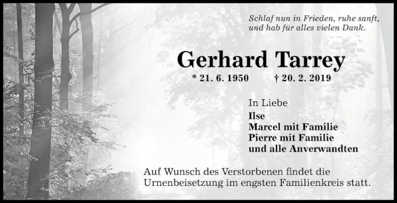 Hier finden Sie alle Traueranzeigen aus der Zeitung, die bisher für Gerhard Tarrey erschienen sind. Weitere Traueranzeigen, die in der Zeitung erscheinen, werden hier ebenfalls aufgelistet