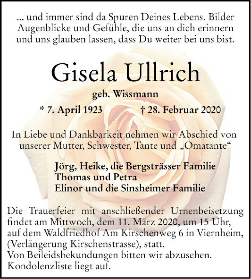 Hier finden Sie alle Traueranzeigen aus der Zeitung, die bisher für Gisela Ullrich erschienen sind. Weitere Traueranzeigen, die in der Zeitung erscheinen, werden hier ebenfalls aufgelistet