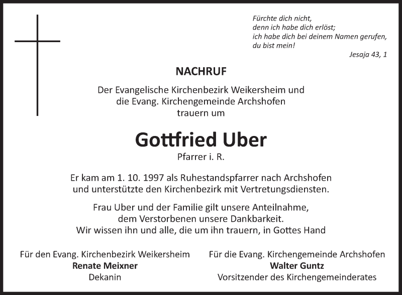 Hier finden Sie alle Traueranzeigen aus der Zeitung, die bisher für Gottfried Uber erschienen sind. Weitere Traueranzeigen, die in der Zeitung erscheinen, werden hier ebenfalls aufgelistet