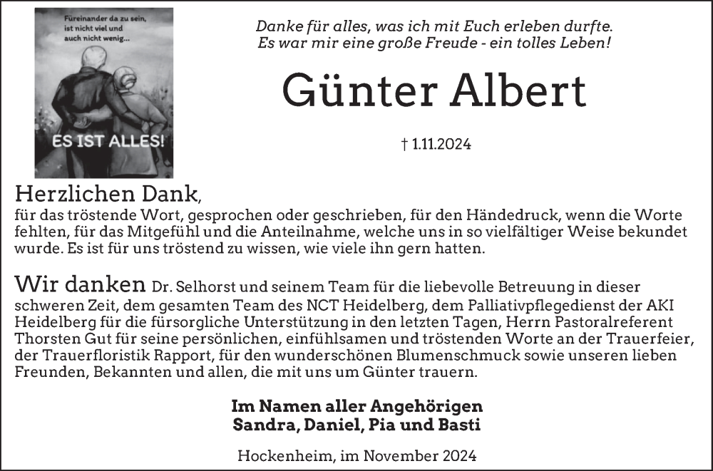 Hier finden Sie alle Traueranzeigen aus der Zeitung, die bisher für Günter Albert erschienen sind. Weitere Traueranzeigen, die in der Zeitung erscheinen, werden hier ebenfalls aufgelistet
