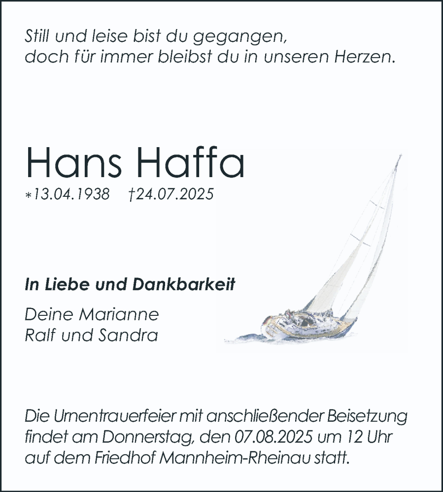 Hier finden Sie alle Traueranzeigen aus der Zeitung, die bisher für Hans Haffa erschienen sind. Weitere Traueranzeigen, die in der Zeitung erscheinen, werden hier ebenfalls aufgelistet