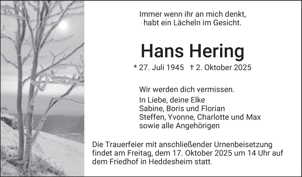 Hier finden Sie alle Traueranzeigen aus der Zeitung, die bisher für Hans Hering erschienen sind. Weitere Traueranzeigen, die in der Zeitung erscheinen, werden hier ebenfalls aufgelistet