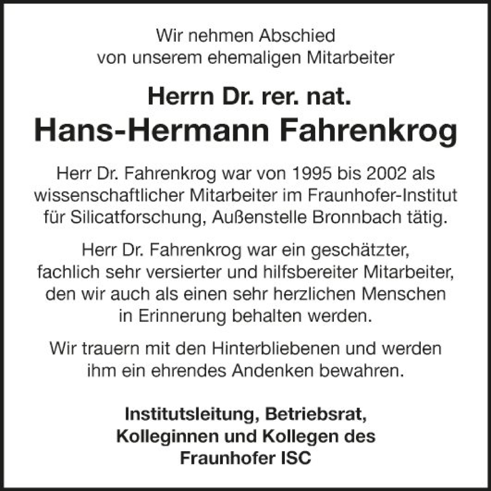 Hier finden Sie alle Traueranzeigen aus der Zeitung, die bisher für Hans-Hermann Fahrenkrog erschienen sind. Weitere Traueranzeigen, die in der Zeitung erscheinen, werden hier ebenfalls aufgelistet