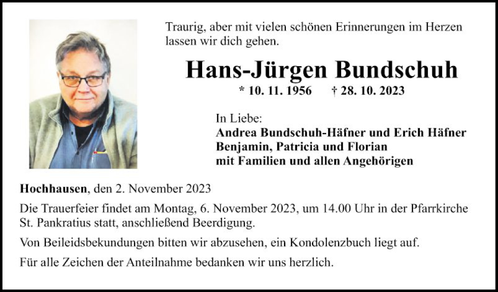 Hier finden Sie alle Traueranzeigen aus der Zeitung, die bisher für Hans-Jürgen Bundschuh erschienen sind. Weitere Traueranzeigen, die in der Zeitung erscheinen, werden hier ebenfalls aufgelistet