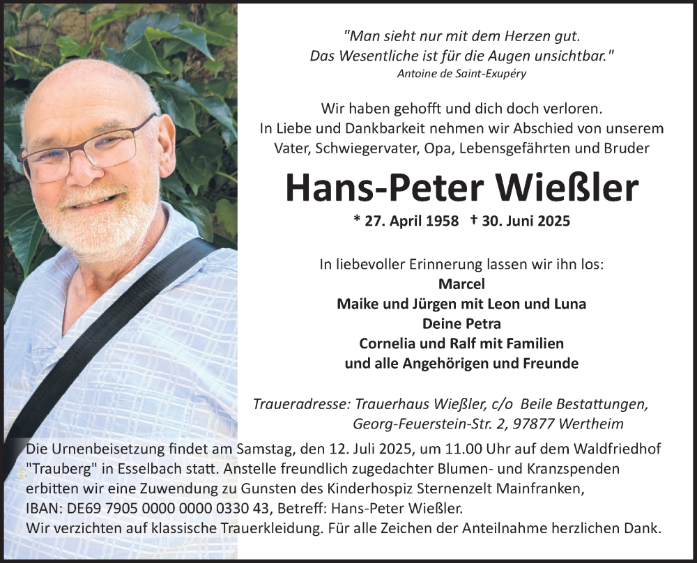 Hier finden Sie alle Traueranzeigen aus der Zeitung, die bisher für Hans-Peter Wießler erschienen sind. Weitere Traueranzeigen, die in der Zeitung erscheinen, werden hier ebenfalls aufgelistet
