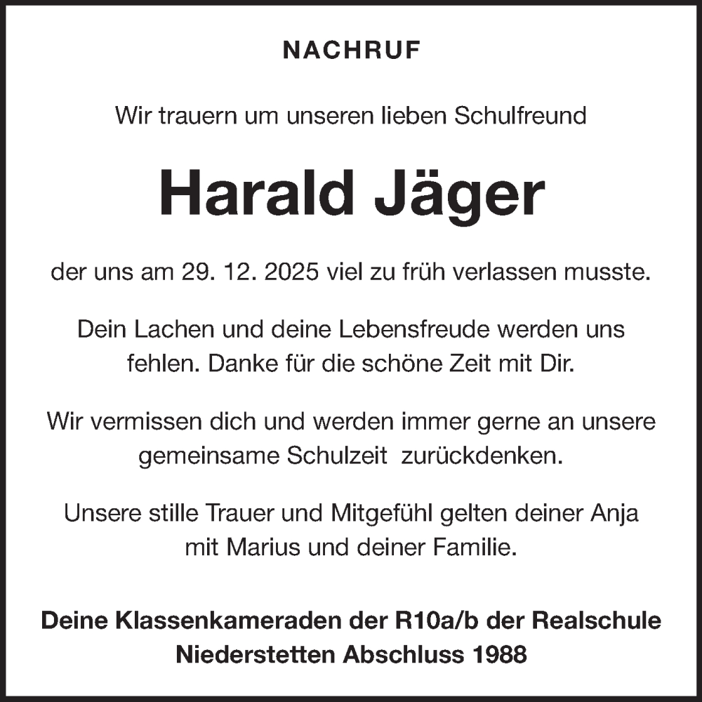 Hier finden Sie alle Traueranzeigen aus der Zeitung, die bisher für Harald Jäger erschienen sind. Weitere Traueranzeigen, die in der Zeitung erscheinen, werden hier ebenfalls aufgelistet