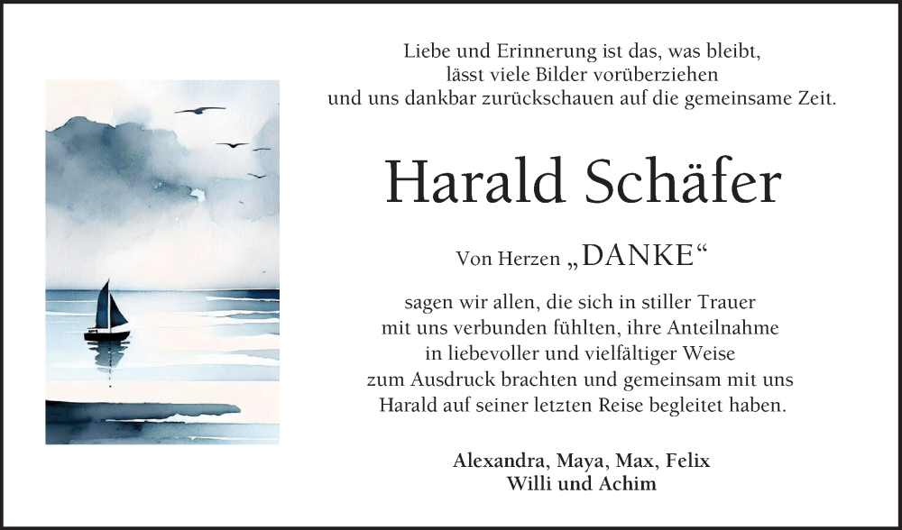 Hier finden Sie alle Traueranzeigen aus der Zeitung, die bisher für Harald Schäfer erschienen sind. Weitere Traueranzeigen, die in der Zeitung erscheinen, werden hier ebenfalls aufgelistet