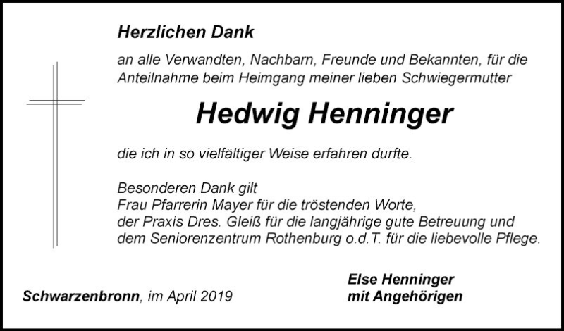 Hier finden Sie alle Traueranzeigen aus der Zeitung, die bisher für Hedwig Henninger erschienen sind. Weitere Traueranzeigen, die in der Zeitung erscheinen, werden hier ebenfalls aufgelistet