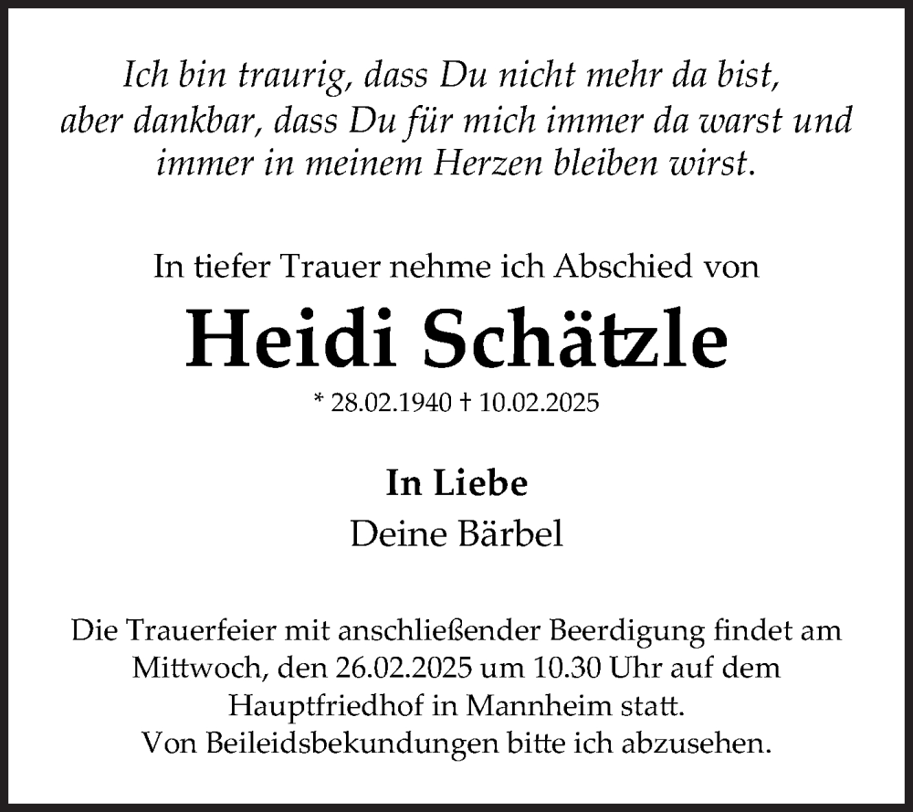 Hier finden Sie alle Traueranzeigen aus der Zeitung, die bisher für Heidi Schätzle erschienen sind. Weitere Traueranzeigen, die in der Zeitung erscheinen, werden hier ebenfalls aufgelistet