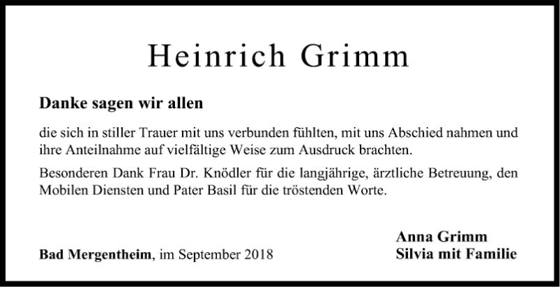 Hier finden Sie alle Traueranzeigen aus der Zeitung, die bisher für Heinrich Grimm erschienen sind. Weitere Traueranzeigen, die in der Zeitung erscheinen, werden hier ebenfalls aufgelistet