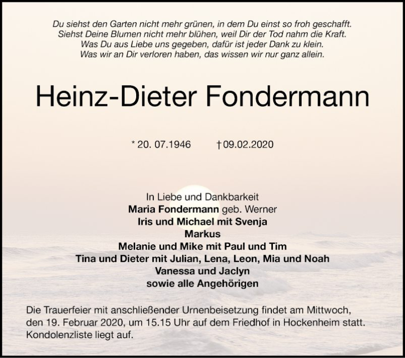 Hier finden Sie alle Traueranzeigen aus der Zeitung, die bisher für Heinz-Dieter Fondermann erschienen sind. Weitere Traueranzeigen, die in der Zeitung erscheinen, werden hier ebenfalls aufgelistet