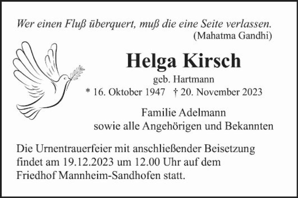 Hier finden Sie alle Traueranzeigen aus der Zeitung, die bisher für Helga Kirsch erschienen sind. Weitere Traueranzeigen, die in der Zeitung erscheinen, werden hier ebenfalls aufgelistet