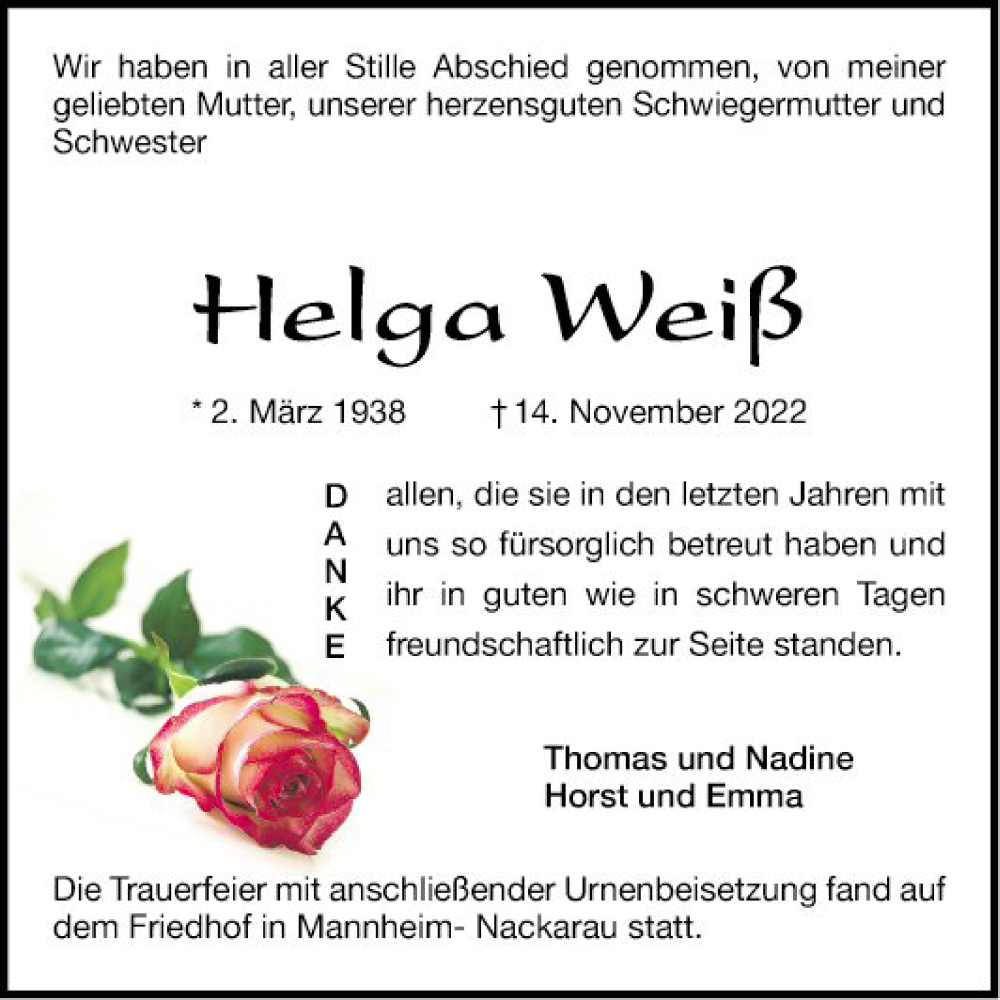 Hier finden Sie alle Traueranzeigen aus der Zeitung, die bisher für Helga Weiß erschienen sind. Weitere Traueranzeigen, die in der Zeitung erscheinen, werden hier ebenfalls aufgelistet