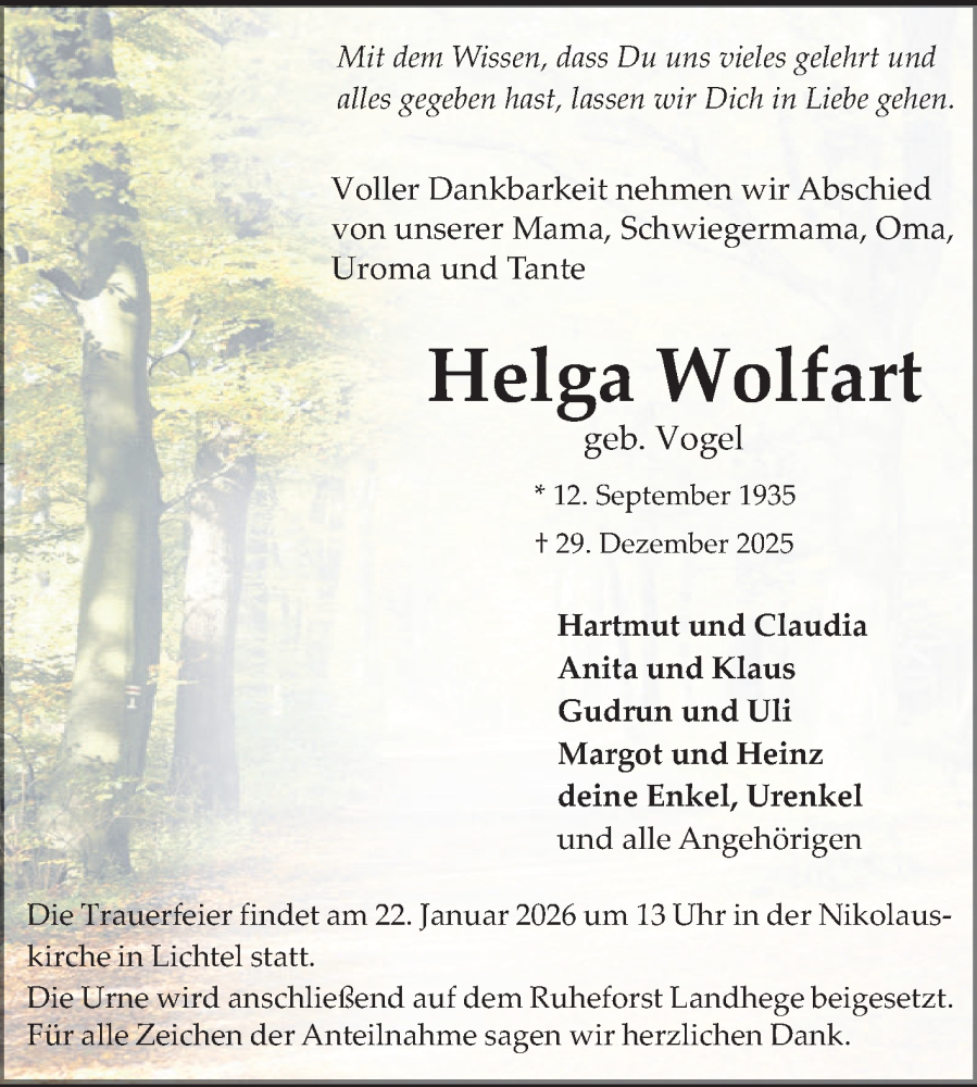 Hier finden Sie alle Traueranzeigen aus der Zeitung, die bisher für Helga Wolfart erschienen sind. Weitere Traueranzeigen, die in der Zeitung erscheinen, werden hier ebenfalls aufgelistet