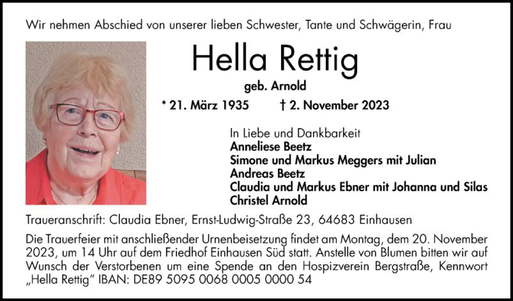 Hier finden Sie alle Traueranzeigen aus der Zeitung, die bisher für Hella Rettig erschienen sind. Weitere Traueranzeigen, die in der Zeitung erscheinen, werden hier ebenfalls aufgelistet