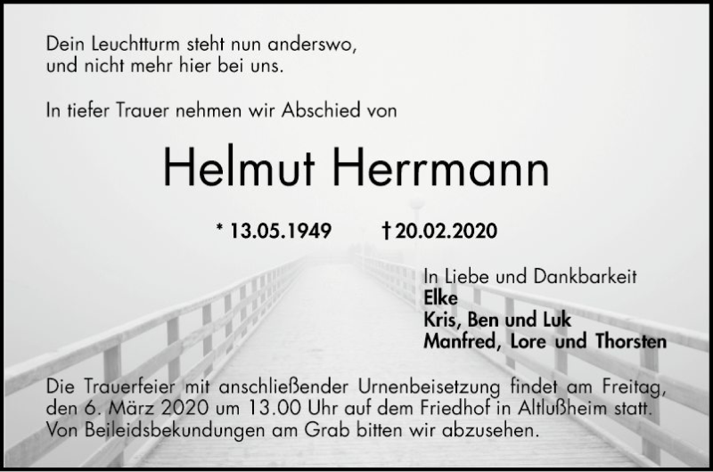 Hier finden Sie alle Traueranzeigen aus der Zeitung, die bisher für Helmut Herrmann erschienen sind. Weitere Traueranzeigen, die in der Zeitung erscheinen, werden hier ebenfalls aufgelistet