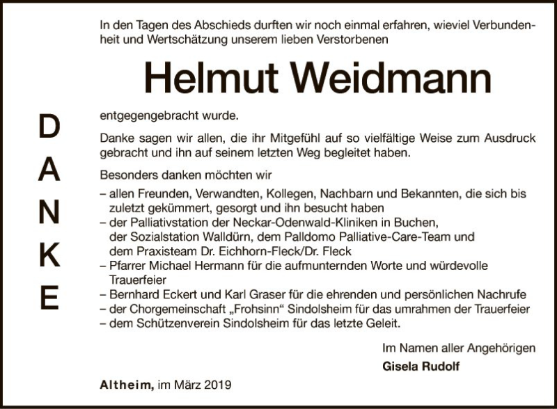 Hier finden Sie alle Traueranzeigen aus der Zeitung, die bisher für Helmut Weidmann erschienen sind. Weitere Traueranzeigen, die in der Zeitung erscheinen, werden hier ebenfalls aufgelistet