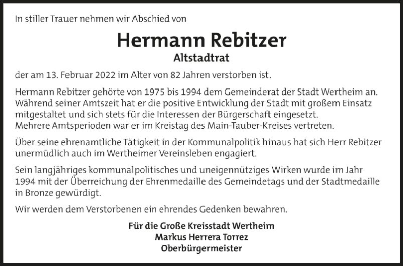 Hier finden Sie alle Traueranzeigen aus der Zeitung, die bisher für Hermann Rebitzer erschienen sind. Weitere Traueranzeigen, die in der Zeitung erscheinen, werden hier ebenfalls aufgelistet