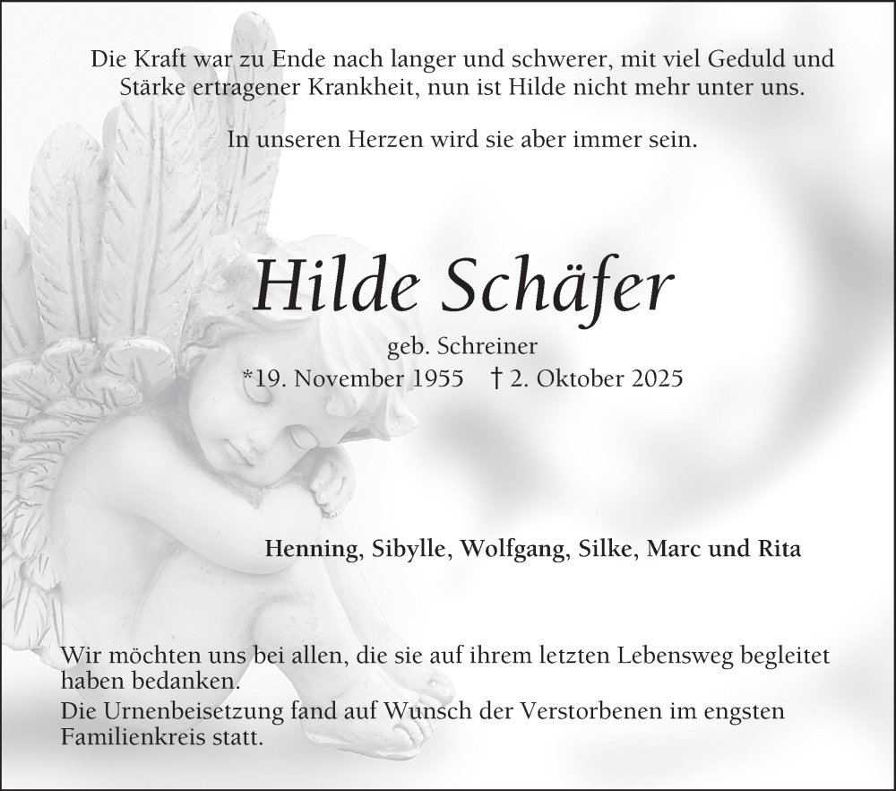 Hier finden Sie alle Traueranzeigen aus der Zeitung, die bisher für Hilde Schäfer erschienen sind. Weitere Traueranzeigen, die in der Zeitung erscheinen, werden hier ebenfalls aufgelistet