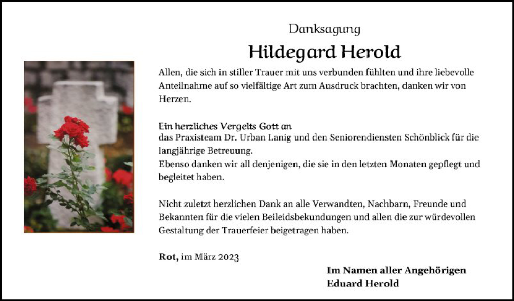 Hier finden Sie alle Traueranzeigen aus der Zeitung, die bisher für Hildegard Herold erschienen sind. Weitere Traueranzeigen, die in der Zeitung erscheinen, werden hier ebenfalls aufgelistet