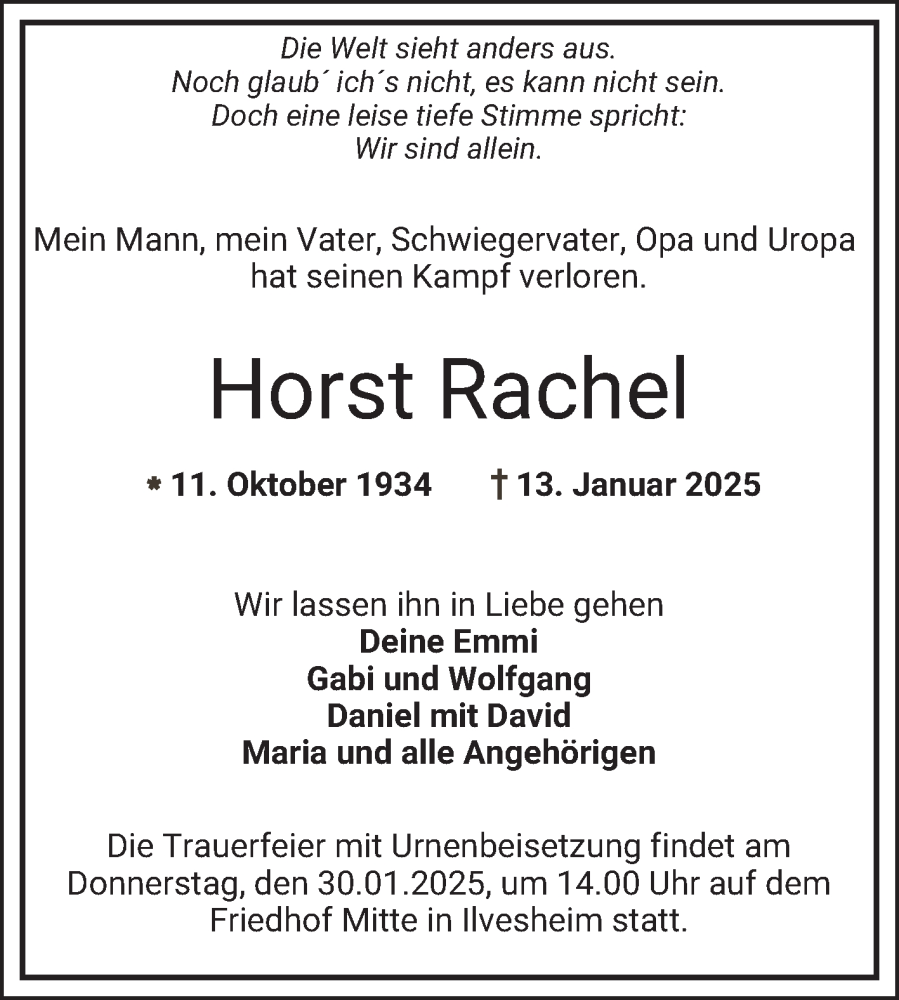 Hier finden Sie alle Traueranzeigen aus der Zeitung, die bisher für Horst Rachel erschienen sind. Weitere Traueranzeigen, die in der Zeitung erscheinen, werden hier ebenfalls aufgelistet