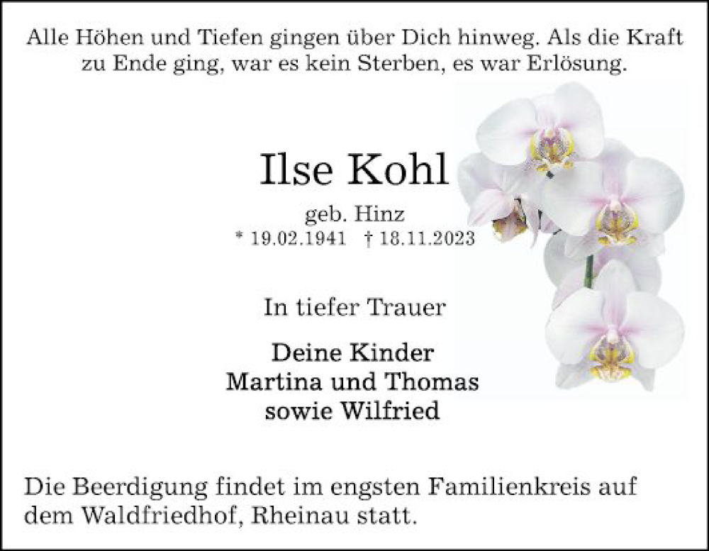 Hier finden Sie alle Traueranzeigen aus der Zeitung, die bisher für Ilse Kohl erschienen sind. Weitere Traueranzeigen, die in der Zeitung erscheinen, werden hier ebenfalls aufgelistet