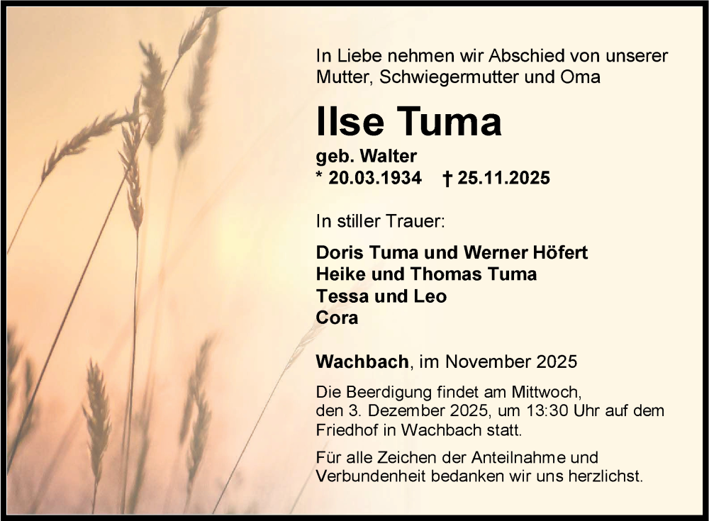 Hier finden Sie alle Traueranzeigen aus der Zeitung, die bisher für Ilse Tuma erschienen sind. Weitere Traueranzeigen, die in der Zeitung erscheinen, werden hier ebenfalls aufgelistet