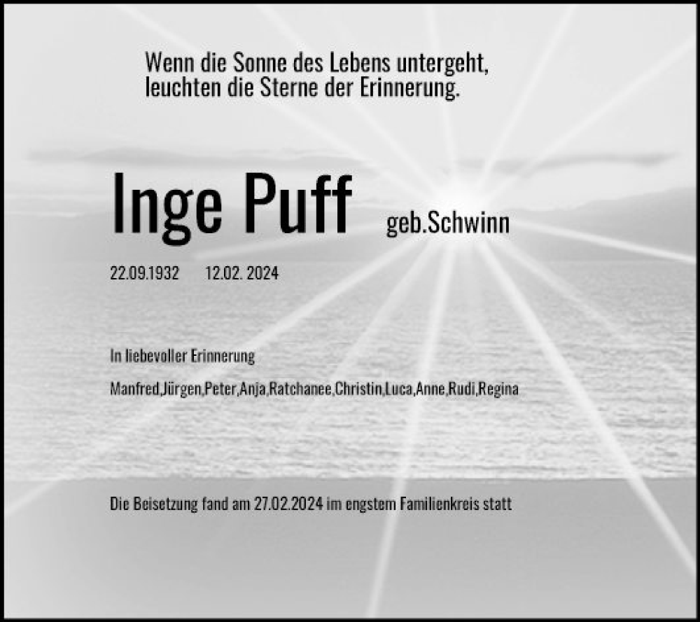 Hier finden Sie alle Traueranzeigen aus der Zeitung, die bisher für Inge Puff erschienen sind. Weitere Traueranzeigen, die in der Zeitung erscheinen, werden hier ebenfalls aufgelistet