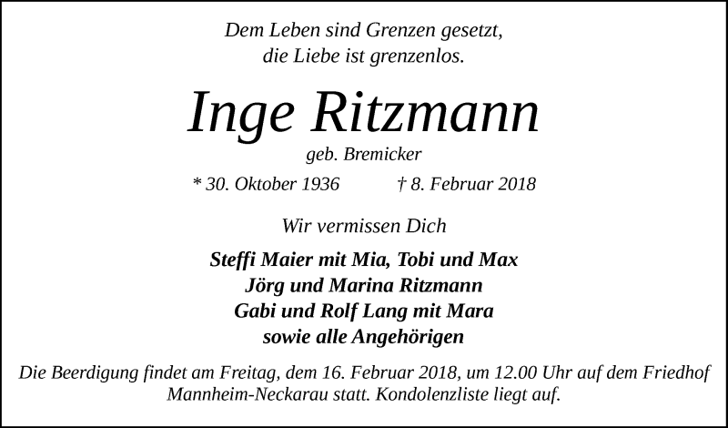 Hier finden Sie alle Traueranzeigen aus der Zeitung, die bisher für Inge Ritzmann erschienen sind. Weitere Traueranzeigen, die in der Zeitung erscheinen, werden hier ebenfalls aufgelistet