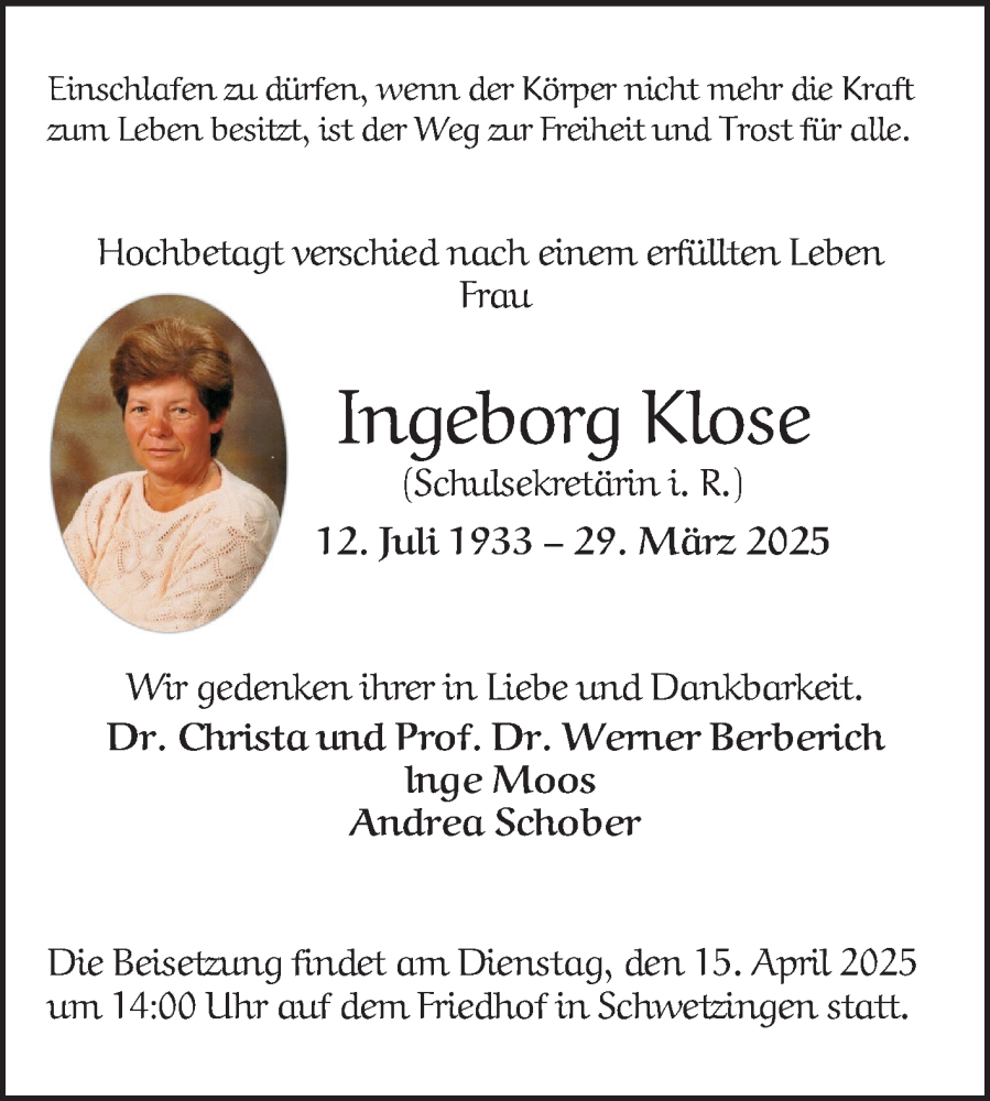 Hier finden Sie alle Traueranzeigen aus der Zeitung, die bisher für Ingeborg Klose erschienen sind. Weitere Traueranzeigen, die in der Zeitung erscheinen, werden hier ebenfalls aufgelistet