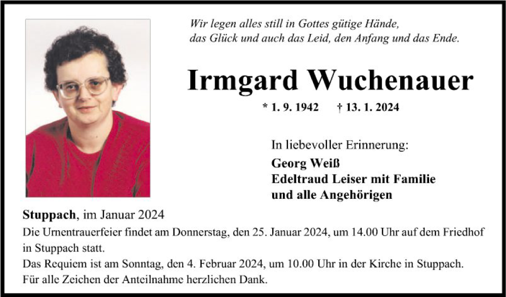 Hier finden Sie alle Traueranzeigen aus der Zeitung, die bisher für Irmgard Wuchenauer erschienen sind. Weitere Traueranzeigen, die in der Zeitung erscheinen, werden hier ebenfalls aufgelistet