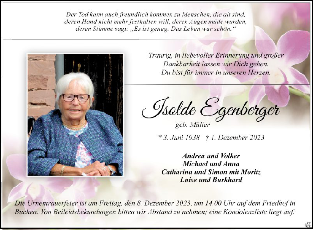 Hier finden Sie alle Traueranzeigen aus der Zeitung, die bisher für Isolde Egenberger erschienen sind. Weitere Traueranzeigen, die in der Zeitung erscheinen, werden hier ebenfalls aufgelistet