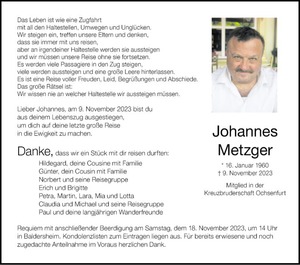Hier finden Sie alle Traueranzeigen aus der Zeitung, die bisher für Johannes Metzger erschienen sind. Weitere Traueranzeigen, die in der Zeitung erscheinen, werden hier ebenfalls aufgelistet
