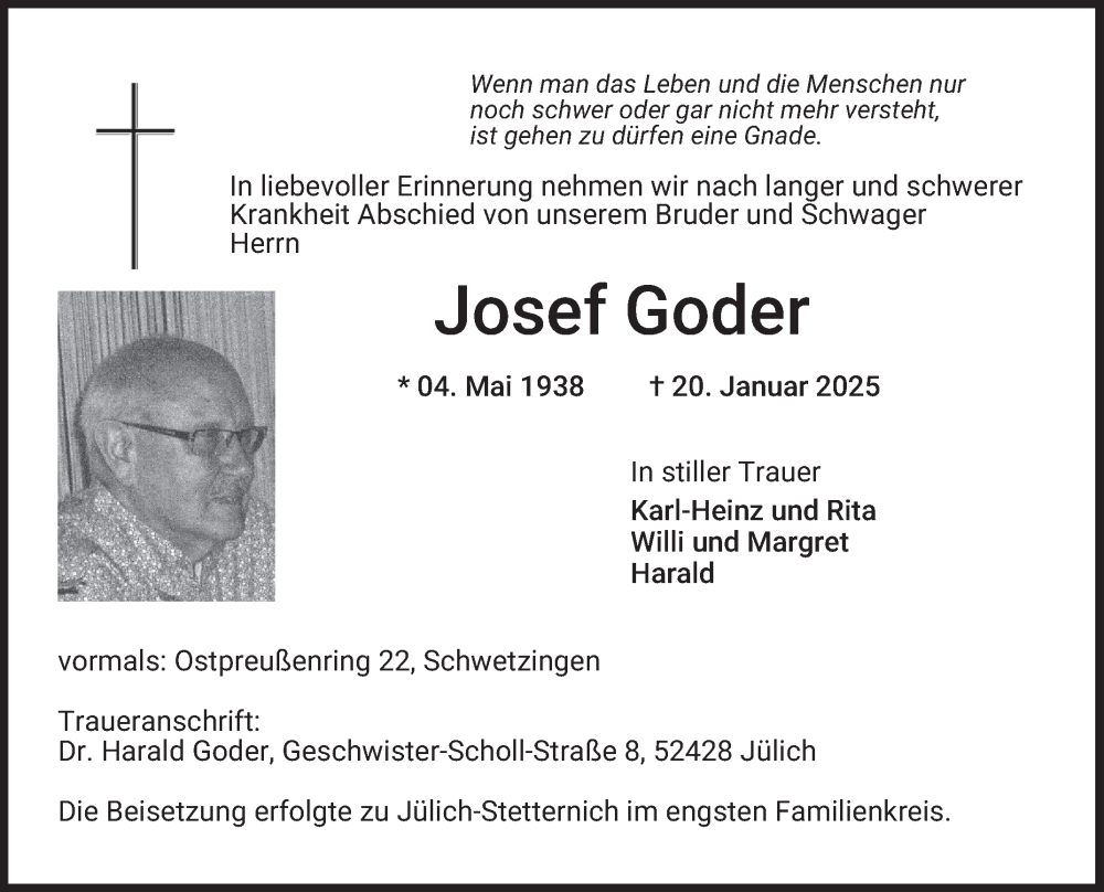 Hier finden Sie alle Traueranzeigen aus der Zeitung, die bisher für Josef Goder erschienen sind. Weitere Traueranzeigen, die in der Zeitung erscheinen, werden hier ebenfalls aufgelistet