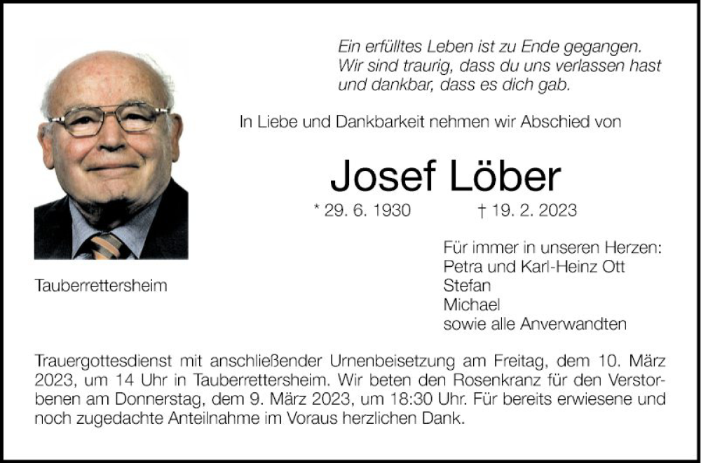 Hier finden Sie alle Traueranzeigen aus der Zeitung, die bisher für Josef Löber erschienen sind. Weitere Traueranzeigen, die in der Zeitung erscheinen, werden hier ebenfalls aufgelistet
