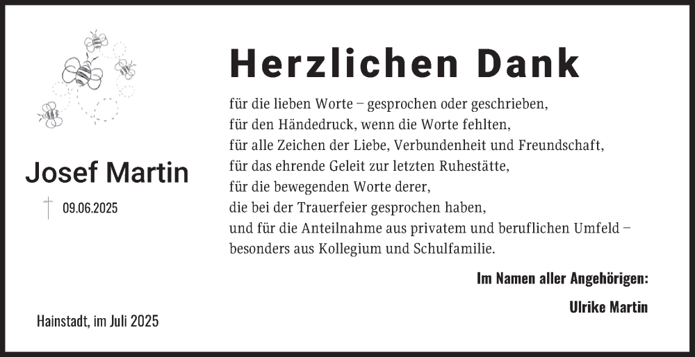 Hier finden Sie alle Traueranzeigen aus der Zeitung, die bisher für Josef Martin erschienen sind. Weitere Traueranzeigen, die in der Zeitung erscheinen, werden hier ebenfalls aufgelistet