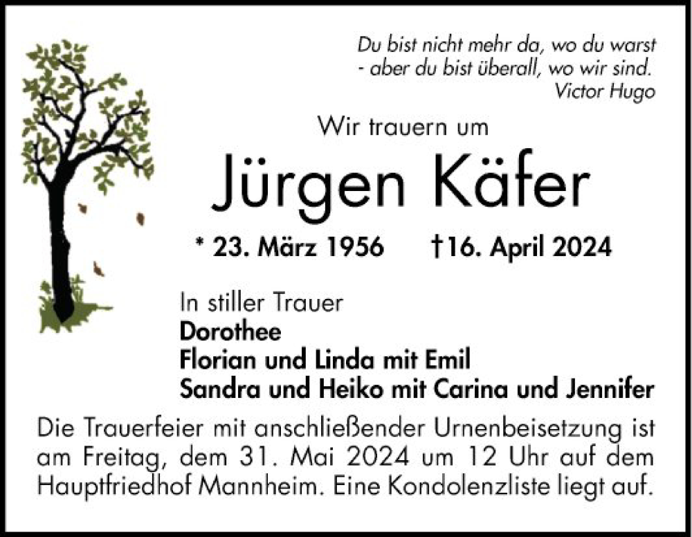 Hier finden Sie alle Traueranzeigen aus der Zeitung, die bisher für Jürgen Käfer erschienen sind. Weitere Traueranzeigen, die in der Zeitung erscheinen, werden hier ebenfalls aufgelistet