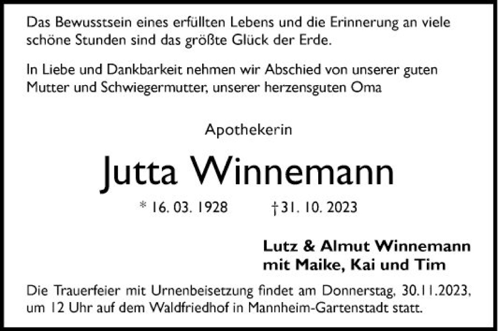 Hier finden Sie alle Traueranzeigen aus der Zeitung, die bisher für Jutta Winnemann erschienen sind. Weitere Traueranzeigen, die in der Zeitung erscheinen, werden hier ebenfalls aufgelistet