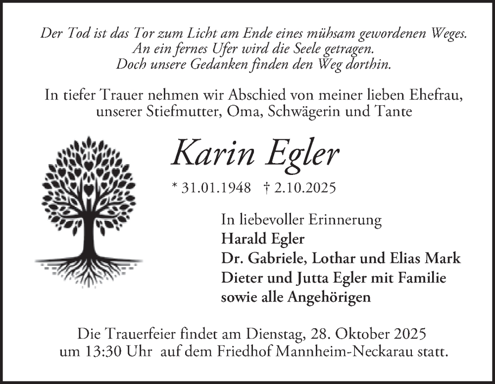 Hier finden Sie alle Traueranzeigen aus der Zeitung, die bisher für Karin Egler erschienen sind. Weitere Traueranzeigen, die in der Zeitung erscheinen, werden hier ebenfalls aufgelistet