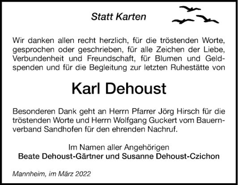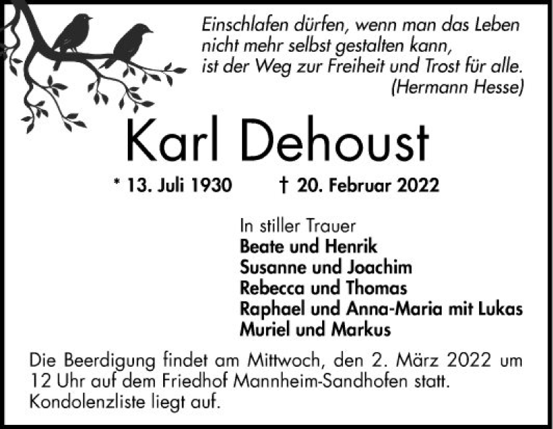 Hier finden Sie alle Traueranzeigen aus der Zeitung, die bisher für Karl Dehoust erschienen sind. Weitere Traueranzeigen, die in der Zeitung erscheinen, werden hier ebenfalls aufgelistet