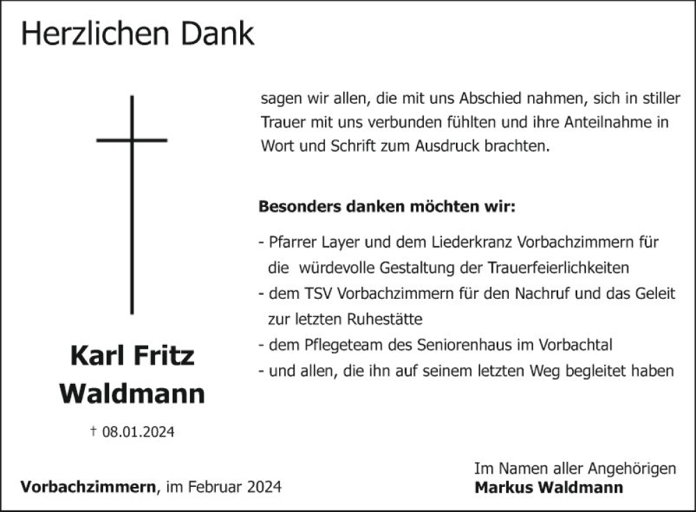 Hier finden Sie alle Traueranzeigen aus der Zeitung, die bisher für Karl Fritz Waldmann erschienen sind. Weitere Traueranzeigen, die in der Zeitung erscheinen, werden hier ebenfalls aufgelistet