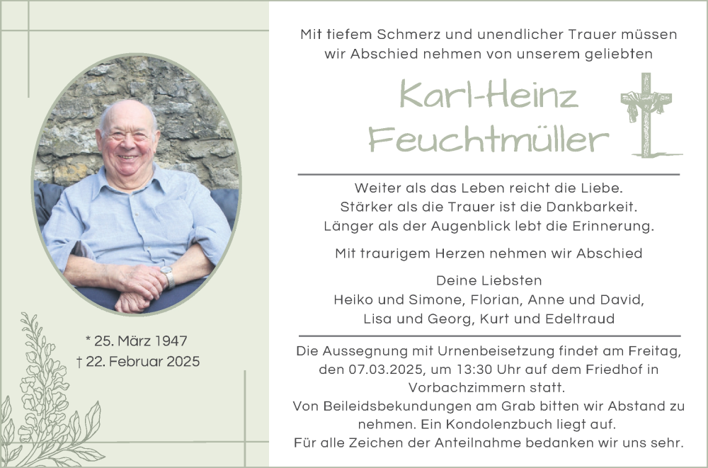 Hier finden Sie alle Traueranzeigen aus der Zeitung, die bisher für Karl-Heinz Feuchtmüller erschienen sind. Weitere Traueranzeigen, die in der Zeitung erscheinen, werden hier ebenfalls aufgelistet