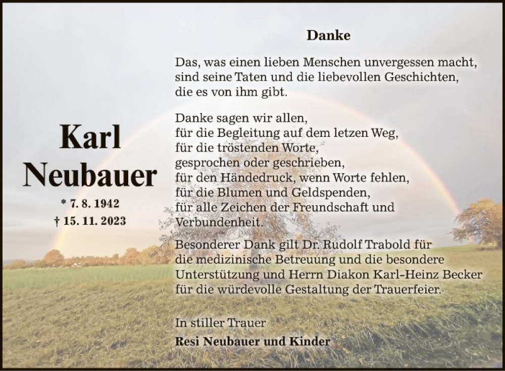 Hier finden Sie alle Traueranzeigen aus der Zeitung, die bisher für Karl Neubauer erschienen sind. Weitere Traueranzeigen, die in der Zeitung erscheinen, werden hier ebenfalls aufgelistet