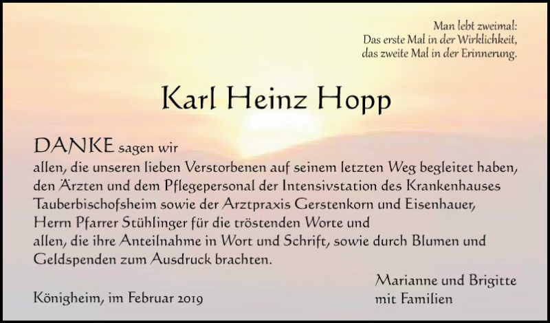 Hier finden Sie alle Traueranzeigen aus der Zeitung, die bisher für Karl Heinz Hopp erschienen sind. Weitere Traueranzeigen, die in der Zeitung erscheinen, werden hier ebenfalls aufgelistet
