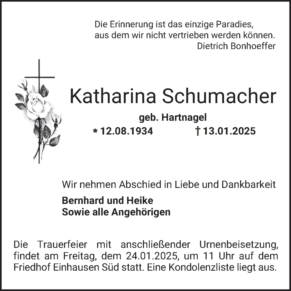Hier finden Sie alle Traueranzeigen aus der Zeitung, die bisher für Katharina Schumacher erschienen sind. Weitere Traueranzeigen, die in der Zeitung erscheinen, werden hier ebenfalls aufgelistet