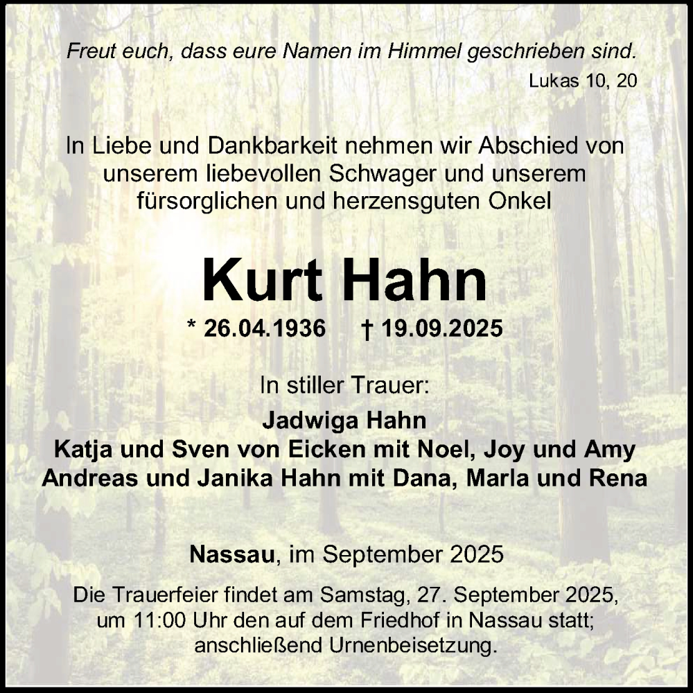 Hier finden Sie alle Traueranzeigen aus der Zeitung, die bisher für Kurt Hahn erschienen sind. Weitere Traueranzeigen, die in der Zeitung erscheinen, werden hier ebenfalls aufgelistet